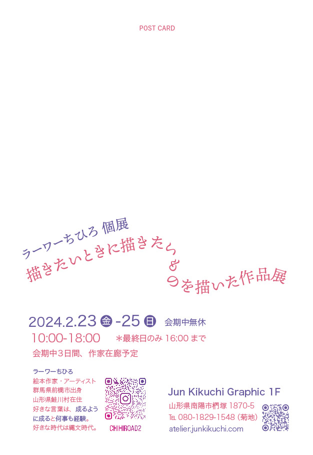 ラーワーちひろ 個展 描きたい時に描きたいものを描いた作品展 2024.2.23(金)-.25(日)10:00-18:00(最終日のみ16:00まで) 会期中、3日間、作家在廊予定 会場/Jun Kikuchi Graphic 1F